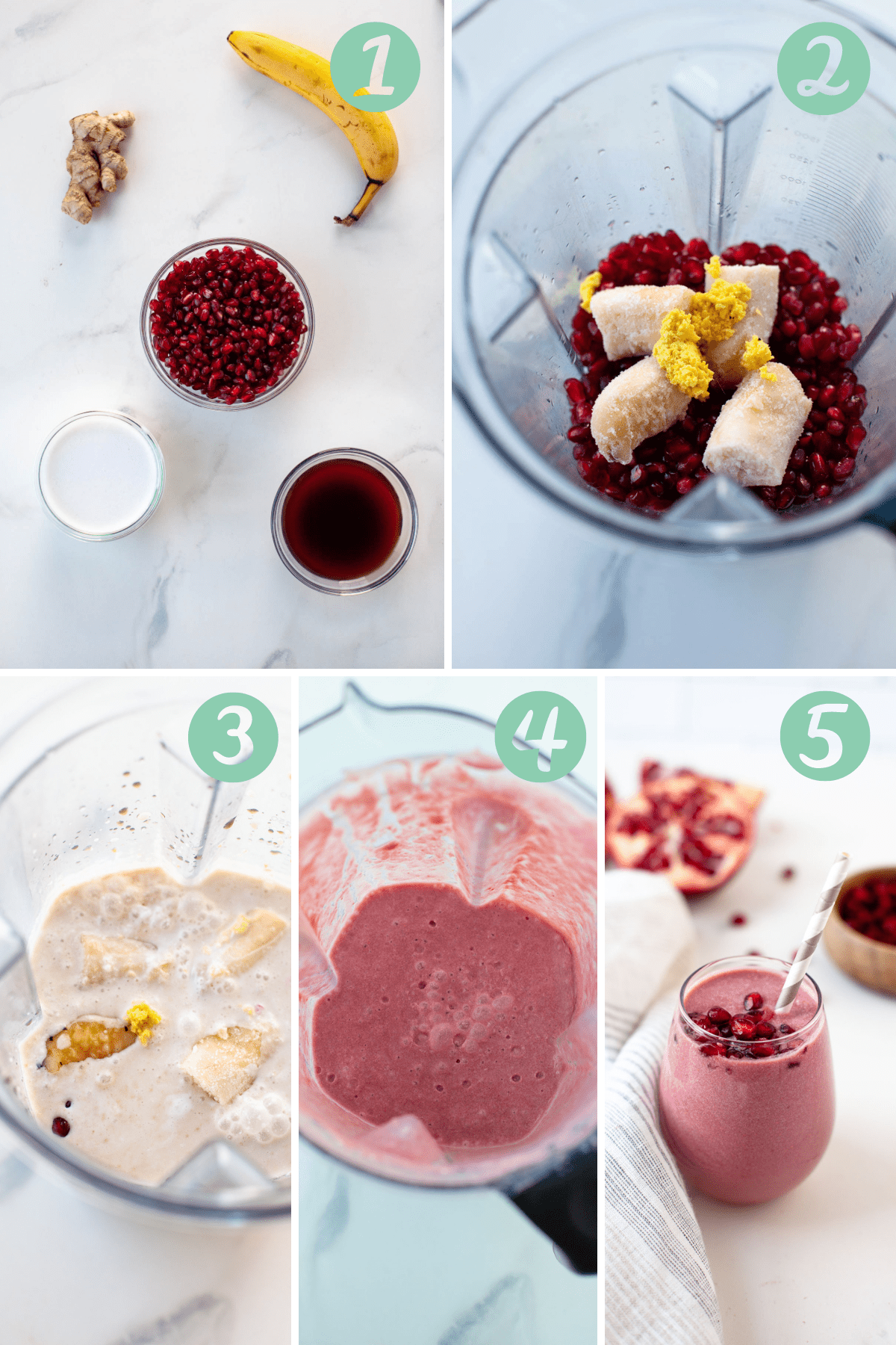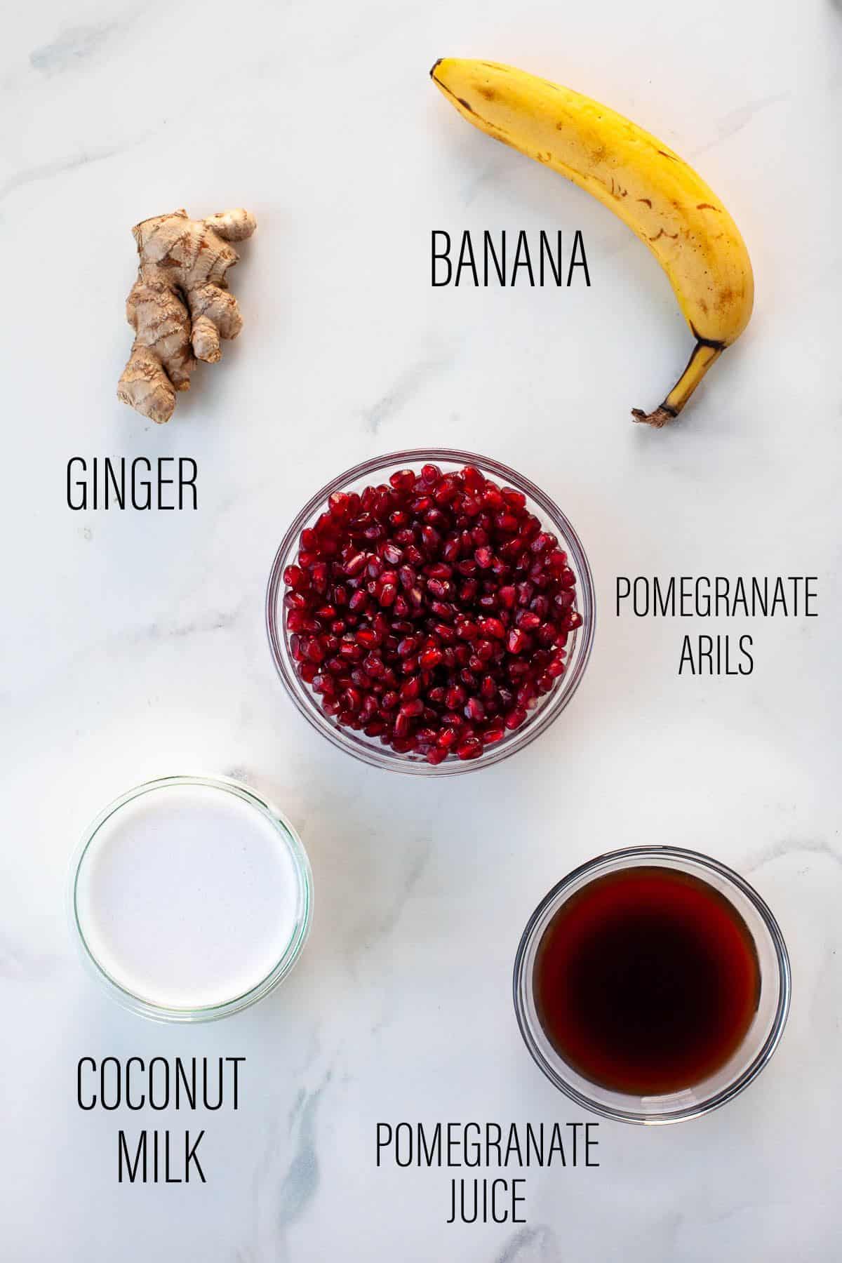 In a high-speed blender, add pomegranate seeds, frozen banana, grated ginger, coconut milk and pomegranate juice.