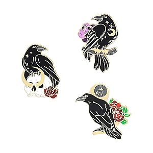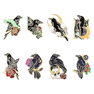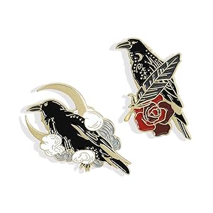 Gothic Enamel Pins Value Set:5 PCS different shapes interesting crow pins in one set,with the Bird Feather Moon Flowers Brooches.The Enamel Lapel Pins bring you the different steampunk experience. you can choose anyone you like according to your preference, also nice gift for friends.