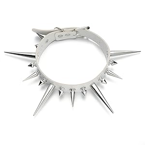 Size: The Longest Spike length 5.6cm /2.2″, The other spikes length 2.9cm/1.14″,the shortest spikes length 1.5cm/0.59″ , The Strap Choker Total length 43cm/16.9″, width2.4cm/0.98″, adjustable from 31- 41cm/12.2-15.4″.