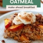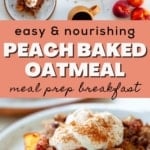 This nourishing and cozy peach baked oatmeal is easy to make ahead of time and reheat throughout the week! Baked with fresh peaches and warming spices, this breakfast is perfect for summer or fall!