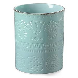 This large utensil crock is 7.2″ tall and 6.2″ wide. It can hold plenty of large kitchen accessories and help you to make the best use of your kitchen spaces.