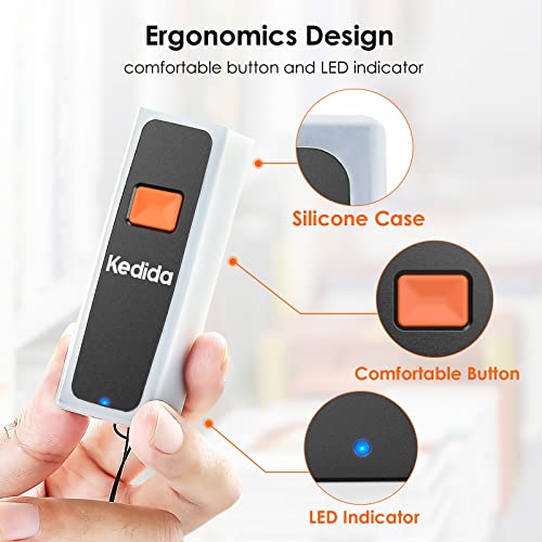 2D Mini Scanner: Kedida wireless scanner is light and portable for carry around with you for the long haul. With a wrist strap to prevent the scanner from accidentally falling and Silicone Case to help against dust and resist the impact.