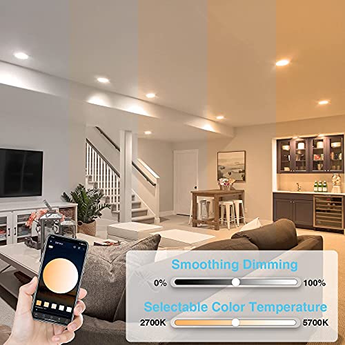 2-in-1 Design & Ultra Bright – The latest smart recessed ceiling lighting fulfills the multi-functions for daily and party ambient lighting needs, and adopts quality LED chips to ensure 1100LM uniform light output with low watts consumption to save energy cost. This smart led canless recessed lighting features 16 million colors, DIY mode, selectable color temperature from 2700K to 5700K, and smooth dimming from 0%-100% for daily, party and festival lighting needs.