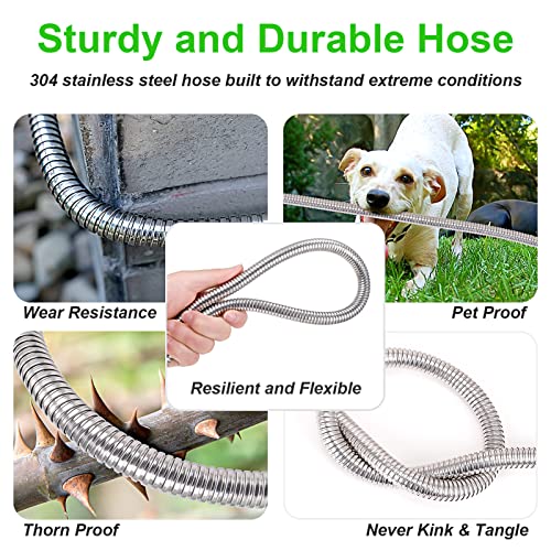 ?DISIGNED for GARDEN?The soft inner tube is encased in a flexible stainless-steel outer layer allows for a consistent, steady and high-pressure water output in outdoor usage, meaning it will allows maneuvering across yard trees, corners, stones easier than ever before.