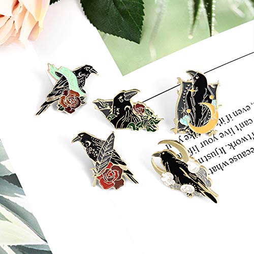 Gothic Enamel Pins Value Set:5 PCS different shapes interesting crow pins in one set,with the Bird Feather Moon Flowers Brooches.The Enamel Lapel Pins bring you the different steampunk experience. you can choose anyone you like according to your preference, also nice gift for friends.