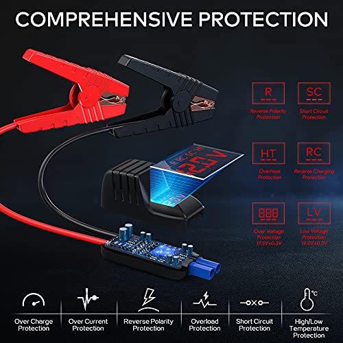 Start Security: Raise the level of safety. Battery jump starter has 8 advanced safety protection technologies to protect you and the equipment. Package includes: Jump Starter, Smart Jumper Clamps, Data Line, Semi-Hard Case, User Manual, Packing Box.