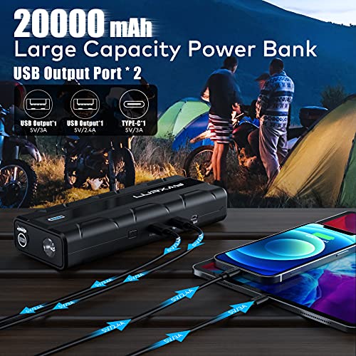 Large Capacity: It’s not only a jump starters, but also a power bank. With a capacity of 20000mAh, it can charge almost everything. Supports USB fast charging and Type-C input (5V/3A) to meet the simultaneous charging needs of two devices.