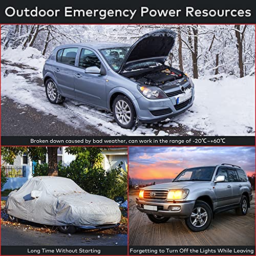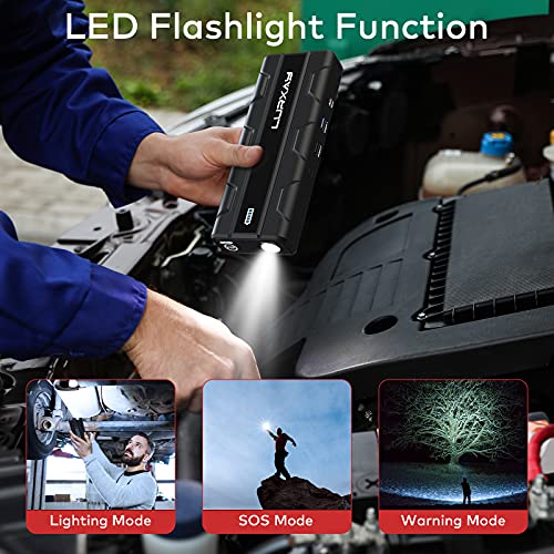 Additional Functions: Battery jump starter has a built-in LED flashlight, and the super bright LED work light has 3 modes: lighting, SOS and warning modes. It is convenient to carry during travel, camping or emergency, and provides light quickly.