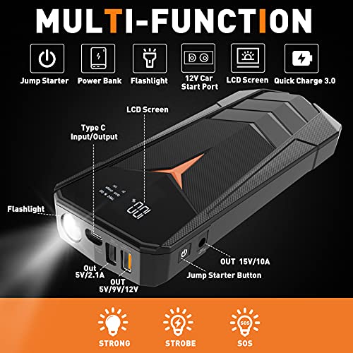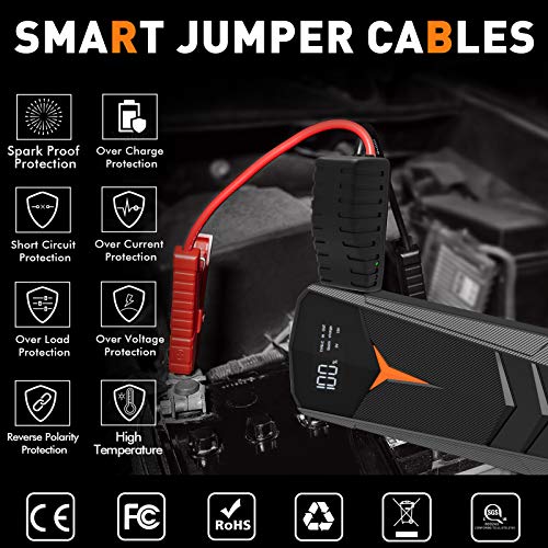 【Multi-Function】The specially designed indicator notifies you of incorrect use with an audible buzz and flashing lights. It also has a built-in LED flashlight with 3 modes: Flashlight, Strobe, SOS. The digital LCD screen clearly displays the remaining power. The 12V/10A DC port can power for other car products (cigarette lighter adapter is included).