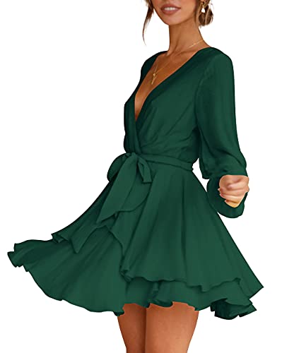 Cosonsen Women’s Dress Deep V-Neck Long Sleeve Waist Tie Ruffle Mini Swing Skater Dresses