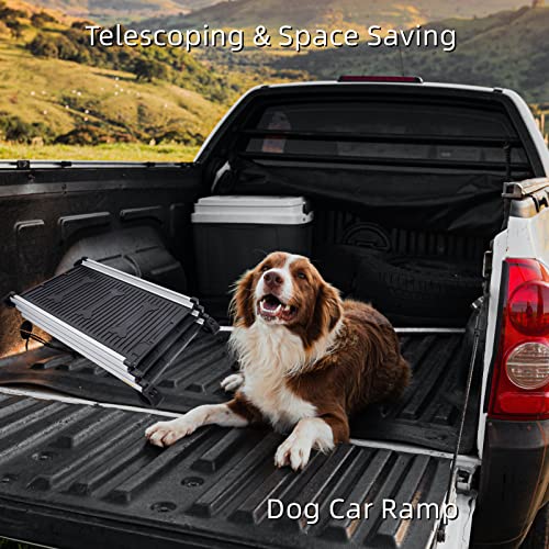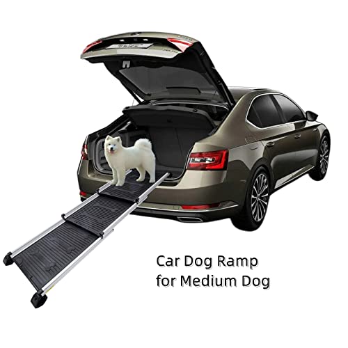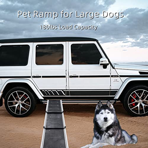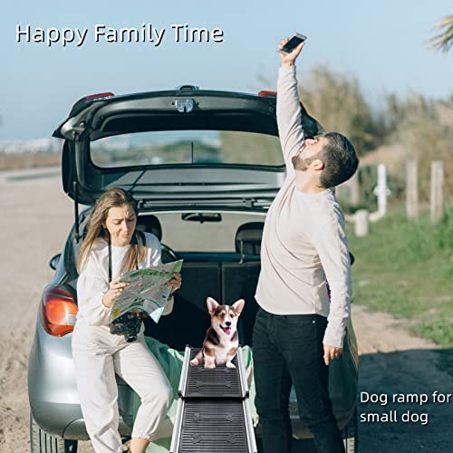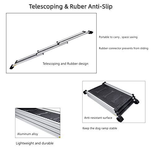 Safe and Friendly: The dog car ramp is covered with high-qualified aluminum alloy, durable rubber feet, and textured ABS plastic surface for better grip. No worry about your dear pet friend jumping or walking on the ramp.