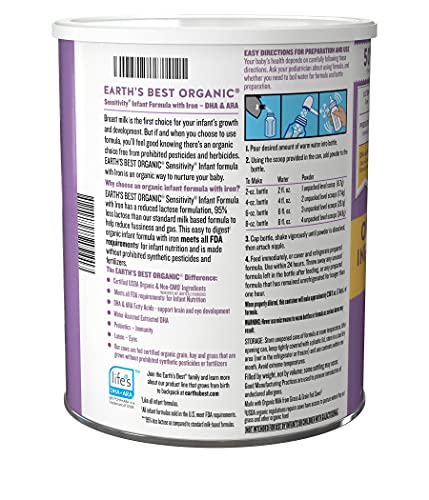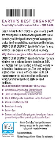 Earths Best Organic Sensitivity Infant Formula with iron is designed especially for babies with fusiness, gas or crying. It is a reduced lactose* formula that is easy for little tummies to digest. It is fortified with iron and contains DHA and ARA, two fatty acids found in breast milk that help support brain and eye health. It also contains lutein for eyes and prebiotic fiber for immunity. *95% less lactose as compared to standard milk based formulas