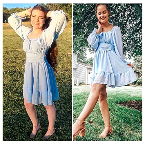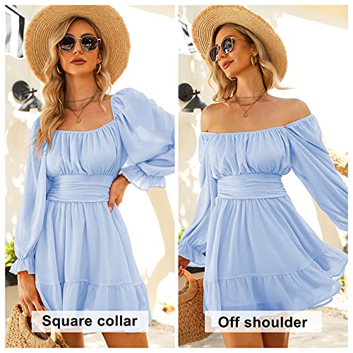 EXLURA Women Tie Back Wedding Guest Dresses Long Lantern Sleeve Square Neck Ruffle Elastic Waist Aline Casual Mini Dress