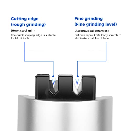 ►2-STAGE SHARPENING TOOL: Tungsten carbide blades (rough grinding) for quick edge setting, suitable for blunt cutters; Ceramic blades(fine grinding) for fine honing,repair knife scratches, eliminate small burr blade.The material is durable and wear-resistant, safe and convenient.