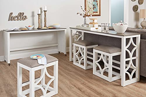 Complete your next living space with the most versatile nesting sofa bar you will ever need. Two tables means twice the room and functionality as well as 3 stools. Use this table for extra eating space when you have guest. Turn the second table “L” shape and make yourself or your kids a desk to work from. Add this table behind your sofa or against the wall and display your photos, decor and more; then when you need to entertain pull out the second table and stools and everyone has room without messing up your decor. Use this table as a buffet table in your kitchen or dinning room. Each stool is padded webbed seating, as well as a kicker plate to protect the finish from getting messed up from shoes. The two toned color scheme of antique white and gray makes decorating easy.
