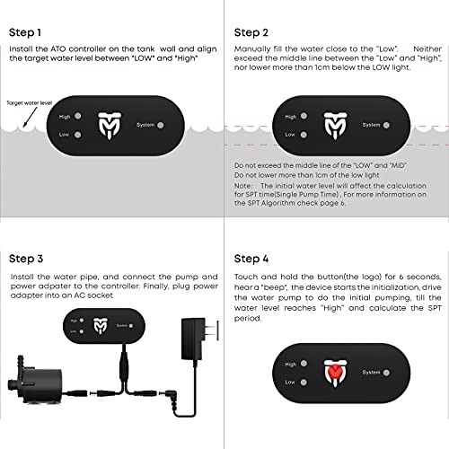 Built-in LED indicator, smart button and alarm buzzer. equipped with a smart button, you can pause the ATO’s function temporarily when you perform maintenance on your tank. 3 different LED colors to indicate its working status. When errors happen, buzzer sets off alarms to remind you.