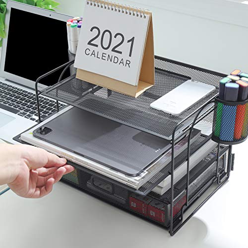 Marbrasse 4-Trays Desktop File Organizer with Pen Holder | Paper Letter Tray with Drawer and 2 Pen Holder | Mesh Office…
