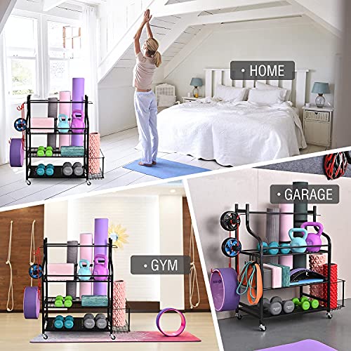 【LARGE CAPACITY STORAGE ORGANIZER】: The storage rack is quipped with 3 layers of metal mesh, a side basket, 3-sectional iron holder and several hanging hooks which can store for various yoga gear and exercise equipment.