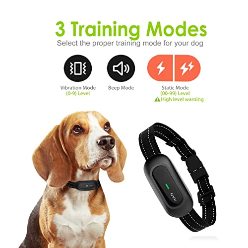 Dog shock collar with 3 training modes: Static Shock (0-99 levels), Vibration (1-9 levels), Beep.