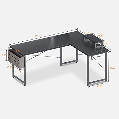 ODK L Shaped Desk, 59″ Computer Corner Desk, Gaming Desk, Home Office Writing Desk with Monitor Shelf, Space-Saving Workstation Desk, Modern Simple Wooden Desk, Easy to Assemble, Black