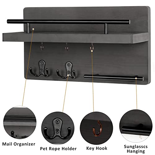 ◆Versatile Storage Key Hanger – Wall mounted Key Holder can aid you to make full use of wall space, avoiding confusion and loss. One small floating shelf to store your mails, bills, letters, newspaper, magazines, wallets, accessories, small plants and more; 2 metal double hooks and 3 single hooks for hanging your keys, umbrella, coat & hat, dog leash, and so on. There is also an area for placing sunglasses in the lower-left corner.