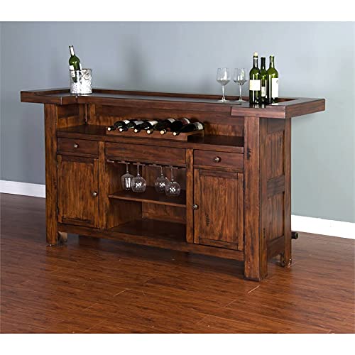 You’ll be the center of attention when you step behind this gorgeous, farmhouse bar unit. With multiple storage compartments, a convenient stemware rack, and additional storage for wine bottles, it’s is ideal for gatherings of all sizes and occasions. With versatile functionality and a pleasingly modern design, this stylish unit makes a delightful addition to any home.