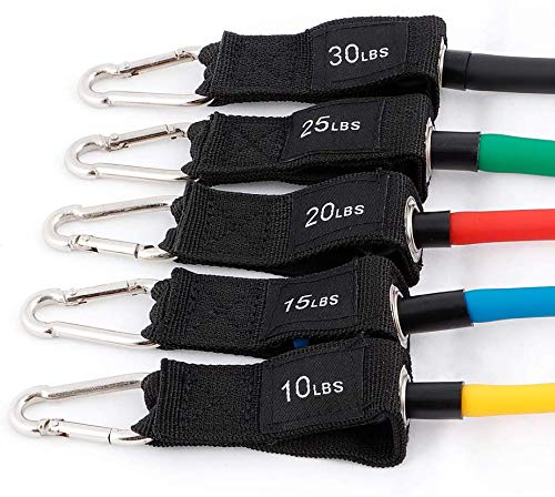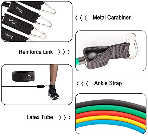 Abundant accessories –bigger head Door anchor, user manual, detachable foam handles, foot ankle straps, band guard, portable carry bag, 5 color coded tube bands (black: 30 lbs. , Green: 25 lbs. , Red: 20 lbs. , Blue: 15 lbs. , yellow: 10 lbs. ).