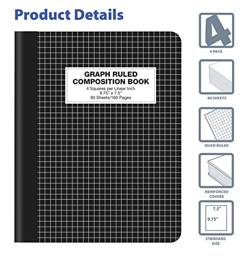 Quad Ruled Composition Book Notebook, 4 Pack, Hardcover 4×4 Graph Ruled Paper, 80 Sheets, 9.75″ x 7.5″, by Better Office Products, Black Cover, 4 Pack