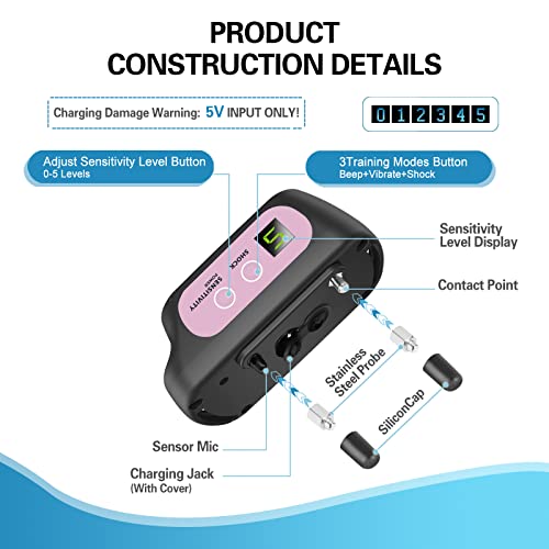 3 Humane Training Modes: Dog bark collar with a beep, vibration, and shock modes, 0-5 adjustable sensitivity levels.