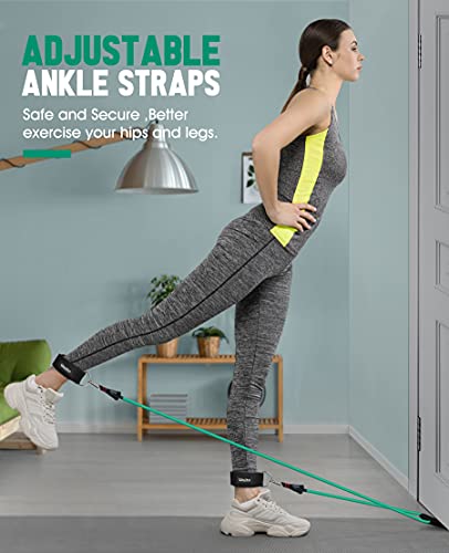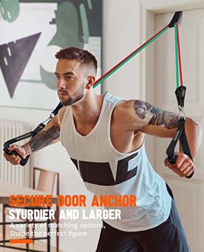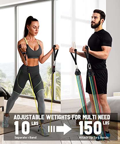 WORKOUT BANDS SET : Includes 5 color resistance tube bands,In addition,Comes with 2 soft-grip handles,1 Door anchor, 2 Ankle straps,1 Carrying bag