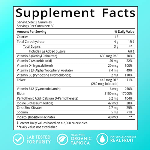 Vitamin A, Vitamin C, Vitamin D, Vitamin E, Vitamin B-6, Folic Acid, Vitamin B-12, Biotin, Pantothenic Acid, Iodine, Zinc, Choline, Inositol, as the active vitamins and minerals