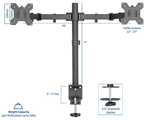 Fits 13″ To 27″ Screens – Dual monitor mount fitting two screens 13” to 27” in size and 22 lbs in weight each with VESA 75x75mm or 100x100mm backside mounting holes.
