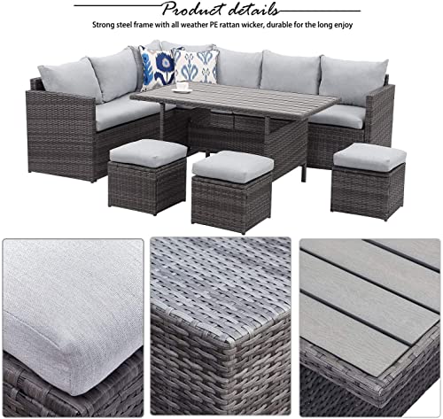 【MODERN & STYLISH】The wicker outdoor sectional with dining table style exemplifies our ideal of “beauty and practicality.” The patio table and chairs can accommodate up to 9 people simultaneously. Multifunctional integration and high reliability bring you the ultimate enjoyment. Perfect for garden, porch, lawn, countryside, poolside, or balcony.