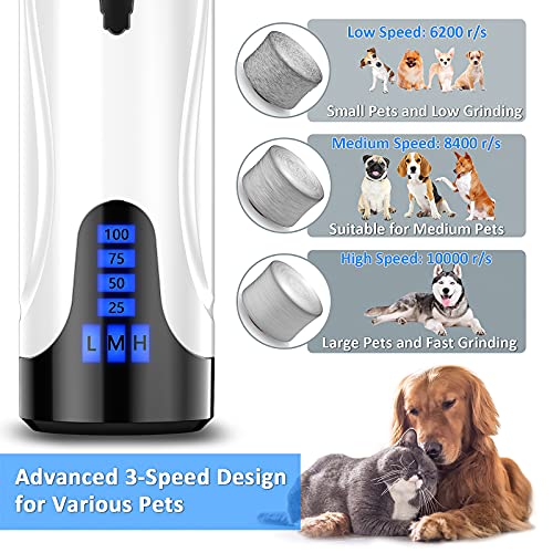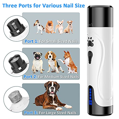 【3-Speeds & 3 Grinding Ports】 The dog nail trimmer has 3 rotation speed setting, powerful enough to support nail grinding of any hardness. And the 3 ports matches small, medium or large pet nails size. You can do home nail grooming like a professional via the appropriate port and speed