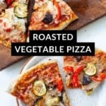 This homemade roasted vegetable pizza is easy to make for a quick dinner and is topped with oven roasted vegetables like eggplant, mushrooms, onion, bell pepper and zucchini.