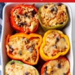 This is mostly a preference! You can cut the tops off and then chop them up for diced peppers to use in another dish. Or, you can cut them in half lengthwise. This way you’re filling your plate with two halves instead of one pepper, it’s a bit easier to cut and eat, and there’s more surface area for melted cheese! If you’re going to go the lengthwise-way, you’ll want to use a large baking dish to fit all the pepper halves!