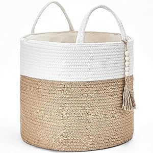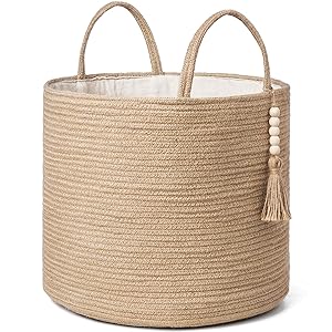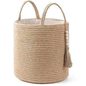 Mkono Woven Storage Basket Decorative Natural Rope Basket Wooden Bead Decoration for Blankets,Toys,Clothes,Shoes,Plant…